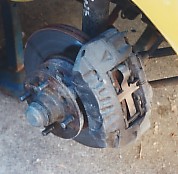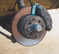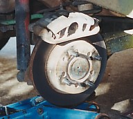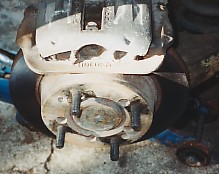 This is a very easy fit and very effective in stopping the car hard and continuously. I have never felt them fade!! Mazda 929 discs - Pathfinder (?) caliper - Skyline struts. The ciggy lighter is there to give an impression of size and NO... the disc is not hot. Its just a trick of the light!!